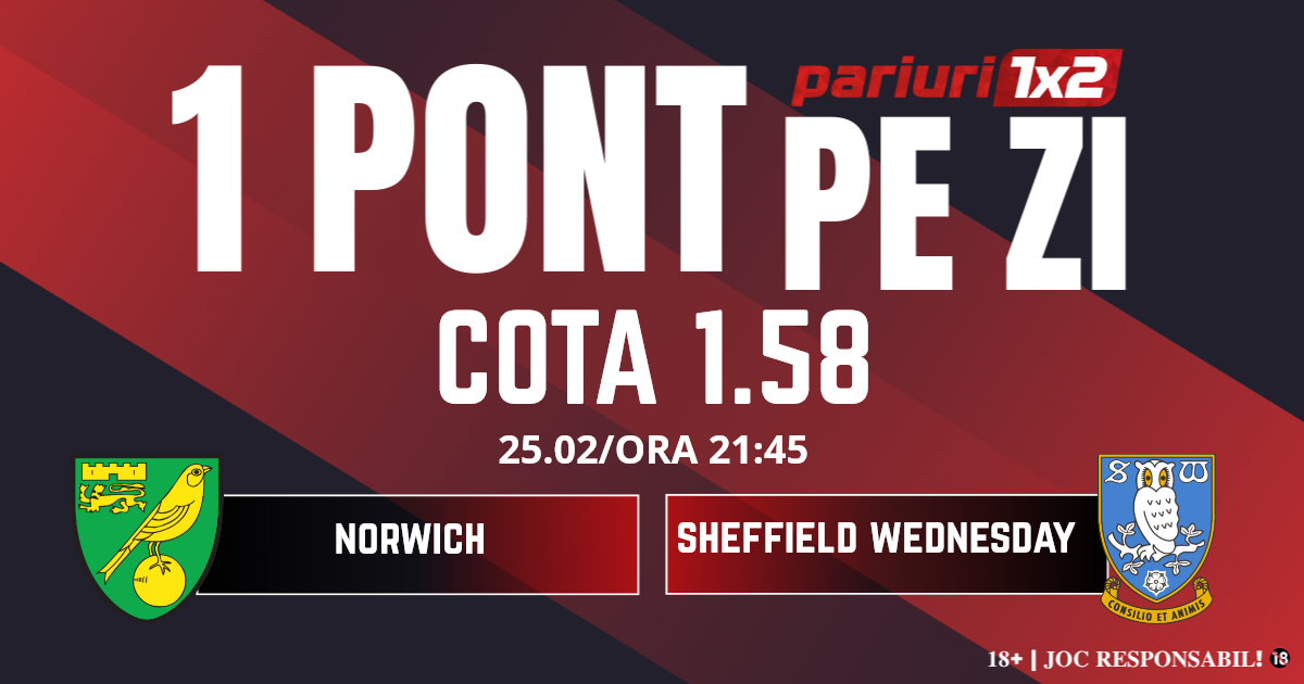 Pentru rubrica Un Pont pe Zi mergem la meciul dintre Norwich și Sheffield Wednesday, partidă contând pentru etapa cu numărul 34 din Championship, al doilea eșalon al fotbalului englez. Duelul dintre cele două formații va avea loc pe Carrow Road, începând cu ora 21.45. Gazdele au trecut prin mari emoții sezonul acesta fiind etape bune pe poziții retrogradabile. Fanii celor de la Norwich nu au scăpat de griji, favoriții lor fiind pe locul 19 cu 39, la doar cinci lungimi de prima poziție retrogradabilă. De partea cealaltă, echipa vizitatoare, măcinată de probleme financiare este deja retrogradată matematic în eșalonul trei. Sheffield Wednesday are cu minus în dreptul punctelor din cauza depunctărilor, iar în 33 de meciuri nu are decât o victorie. Mizăm pe un meci la discreția gazdelor, iar pronosticul nostru este 1 și 2-5 goluri.