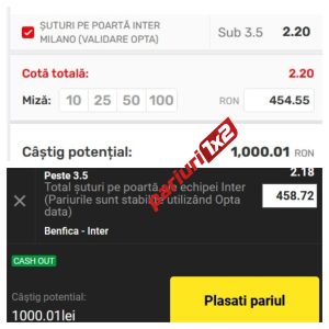 La agentia Superbet, pariul „Inter sub 3.5 șuturi pe poartă” are cota 2.20. Cu miza (informativa) putin peste 454 lei, am avea un profit final brut de 1000 lei.