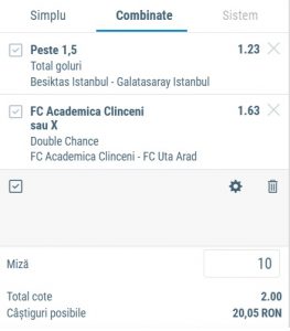 A doua și ultima selecție vine din Turcia, de la derby-ul dintre Besiktas și Galatasaray. Este un meci care promite spectacol și evidențiem faptul că în precedentul duel direct s-a marcat de 4 ori. Nu ne complicăm și mizăm simplu pe cel puțin două schimbări ale tabelei de marcaj.