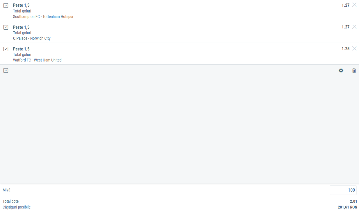 Încheiem biletul zilei de marți cu duelul dintre Watford și West Ham. Formația gazdă are nevoie de puncte pentru a se îndepărta de zona retrogradării, în timp ce oaspeții pot să avanseze pe un loc care duce în cupele europene, dacă se vor impune în această rundă. Ne așteptăm la un duel deschis, în care ambele echipe vor reuși să marcheze. Pariem simplu pe minimum două goluri marcate în meci, selecție care a adus profit în precedentele 5 partide ale lui Watford.