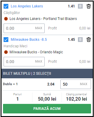 Miercuri, 04:00: Los Angeles Lakers – Portland Trail Blazers: Victorie Los Angeles Lakers (inclusiv prelungiri) – Cota 1.41 la Betano