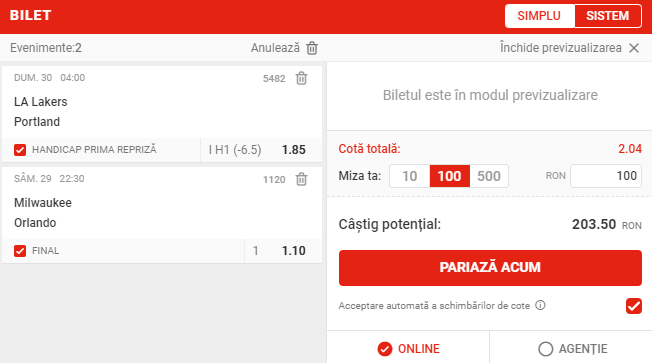 Spectacolul din NBA revine dupa o pauza de trei zile. Astazi avem la dispozitie trei confruntari, iar doua dintre acestea au fost alese de redactia noastra pentru cota de 2. Daca pentru victoria celor de la Bucks nu e nevoie de multe argumente, partida dintre Lakers si Trail Blazers ofera cateva stiri importante. Damian Lillard, vedeta celor de la Portland, a parasit campusul din Orlando din cauza unei accidentari. Astfel, Trail Blazers sunt nevoiti sa incerce imposibilul fara cel mai bun jucator din lot. Ne asteptam ca Lakers sa obtina un succes categoric, iar pe final sa-si odihneasca vedetele. Astfel, mizam pe o prima repriza castigata de favoriti la o diferenta de minim 7 puncte.
