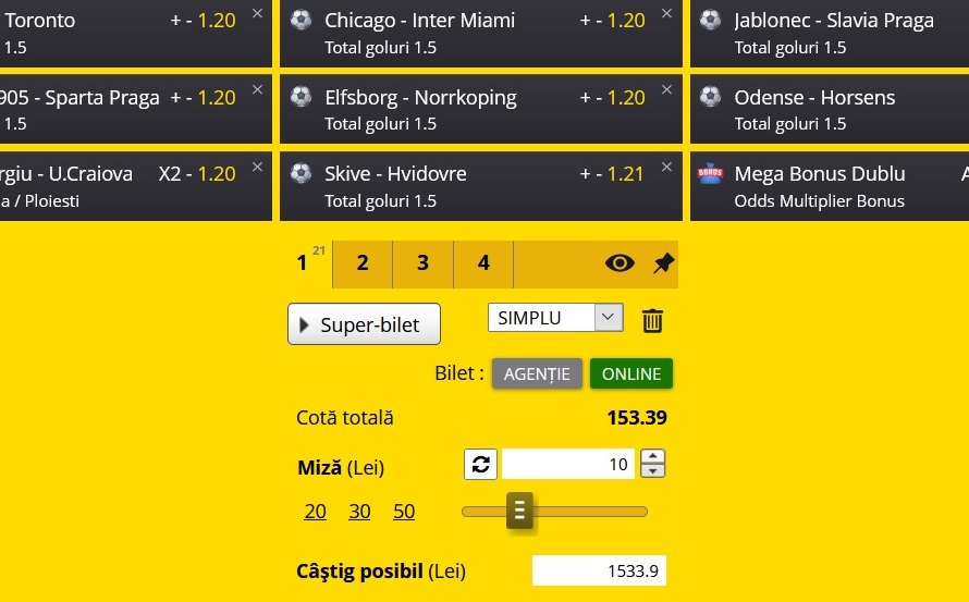 Redactia pariuri1x2.ro a extras 20 de evenimente la cota minima 1.20, tocmai pentru ca acest bilet sa se incadreze in promotia BONUS DUBLU 100%, iar cota finala este de 153! Evenimentele se disputa sambata, duminica si luni.