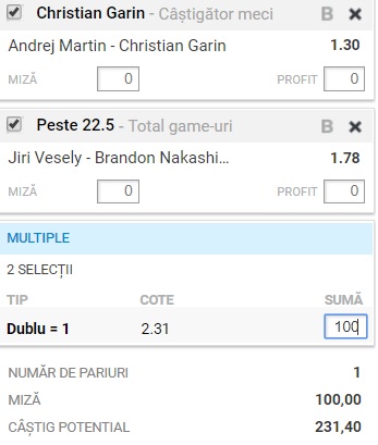 Biletul zilei din tenis aduce in atentia noastra turneele de la Rio de Janeiro si Delray Beach, pentru cota 2.31. Incepand cu ora 21:00, Jiri Vesely si Brandon Nakashima se intalnesc in primul tur al competitiei americane. Cehul vine cu moralul la cote inalte dupa titlul de la Pune, iar americanul de 18 ani este unul dintre cei mai de perspectiva juniori ai lumii. Se anunta un duel echilibrat din toate punctele de vedere, in urma caruia oricare jucator poate obtine victoria. De la ora 21:30, Christian Garin tinteste al doilea succes consecutiv in fata lui Andrej Martin, dupa cel de la Cordoba, punctat la inceputul lunii februarie.