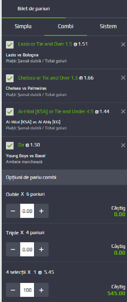 In final, inchidem „combo-ul” cu o selectie din Elvetia. Mai precis, o selectie pe derby-ul campionatului din „Tara Cantoanelor”. Young Boys Berna – FC Basel sta sub semnul spectacolului. „Ros-albastrii” au parte de un sezon excelent, insa nu isi pot depune candidatura serioasa pentru castigarea Superligii decat daca vor reusi sa treaca in meci direct de trupa din capitala. Insa, la randul ei, formatia gazda exceleaza pe partea ofensiva. Astfel, cea mai buna varianta nu poate fi decat „ambele inscriu”.