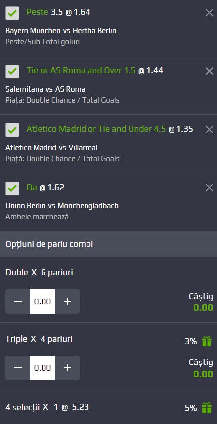 Din Germania trecem in Italia si pariem „X2 & peste 1.5 goluri” in meciul Salernitana – AS Roma (duminica, 21:45). Echipa lui Jose Mourinho are ambitii mari in acest sezon, iar nou-promovata nu ii poate sta in cale. Inchidem „combo-ul” propus cu varianta „1X & sub 4.5 goluri” in partida Atletico Madrid – Villarreal (duminica, 23:00). In acest derby din La Liga, va fi interesant duelul tactic dintre doi super manageri, Diego Simeone si Unai Emery. Mult succes!