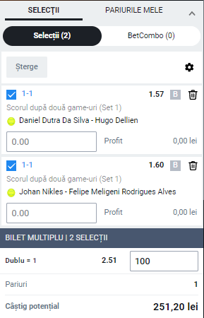 Mie 14:35 Dutra Da Silva – Dellien, scorul dupa doua game-uri: 1-1 – cota 1.57