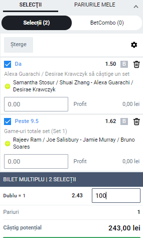 Vineri 19:00 Stosur / Zhang – Guarachi / Krawczyk: Guarachi / Krawczyk castiga minim un set, cota 1.50