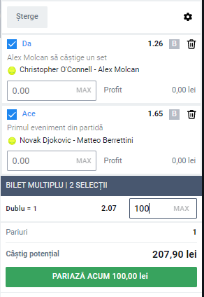 Biletul zilei (11 iulie) este realizat din doua partide. In prima intalnire se anunta un meci exceptional. Sarbul Novak Djokovic il intalneste pe Matteo Berrettini in finala turneului de la Wimbledon. „Djoker-ul” pleaca favorit in aceasta disputa, dar italianul a aratat cat este de puternic pe aceasta suprafata in sezonul actual. Berrettini are un serviciu foarte puternic, iar in semifinale a „livrat” 22 de asi impotriva lui Hurkacz. Pentru aceasta intalnire, cei de la Betano ne-au oferit un pariu foarte interesant: primul eveniment in meci: as. Tinand cont de faptul ca se anunta un duel echilibrat si ambii jucatori sunt foarte buni la serviciu, consideram ca acest pariu este potrivit pentru cota noastra de 2. In cea de-a doua partida, vom miza pe calitatile lui Alex Molcan, care joaca in ultimul tur al calificarilor de la Hamburg, impotriva lui O’Connell. Jucatorul slovac are 41 partide disputate pe zgura in acest sezon, iar in 30 dintre acestea s-a impus.O’Connell are doar 5 partide pe suprafata „portocalie” in stagiunea actuala, fiind un jucator care prefera suprafata dura. Pentru siguranta, am decis sa pariem pe minim un set castigat de catre Alex Molcan.