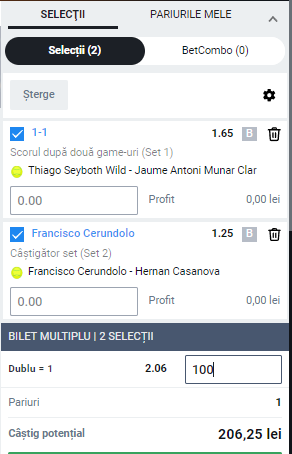 Cerundolo il intalneste pe Casanova in sferturile de finala ale turneului sud-american. Argentinianul de 23 de ani a reusit un sezon foarte bun si este pe cale de a patrunde in Top 100 ATP. Compatriotul sau, Casanova, se afla pe pozitia cu numarul 342 in clasamentul ATP. Mizam pe o victorie in minimul de seturi din partea lui Cerundolo, dar pentru mai multa siguranta am decis sa pariem pe victoria jucatorului mai tanar in actul secund.