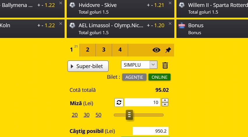 Redactia pariuri1x2.ro a extras 20 de evenimente la cota minima 1.20, tocmai pentru ca acest bilet sa se incadreze in promotia BONUS DUBLU 100%, iar cota finala este de 95! Evenimentele se disputa sambata si duminica.