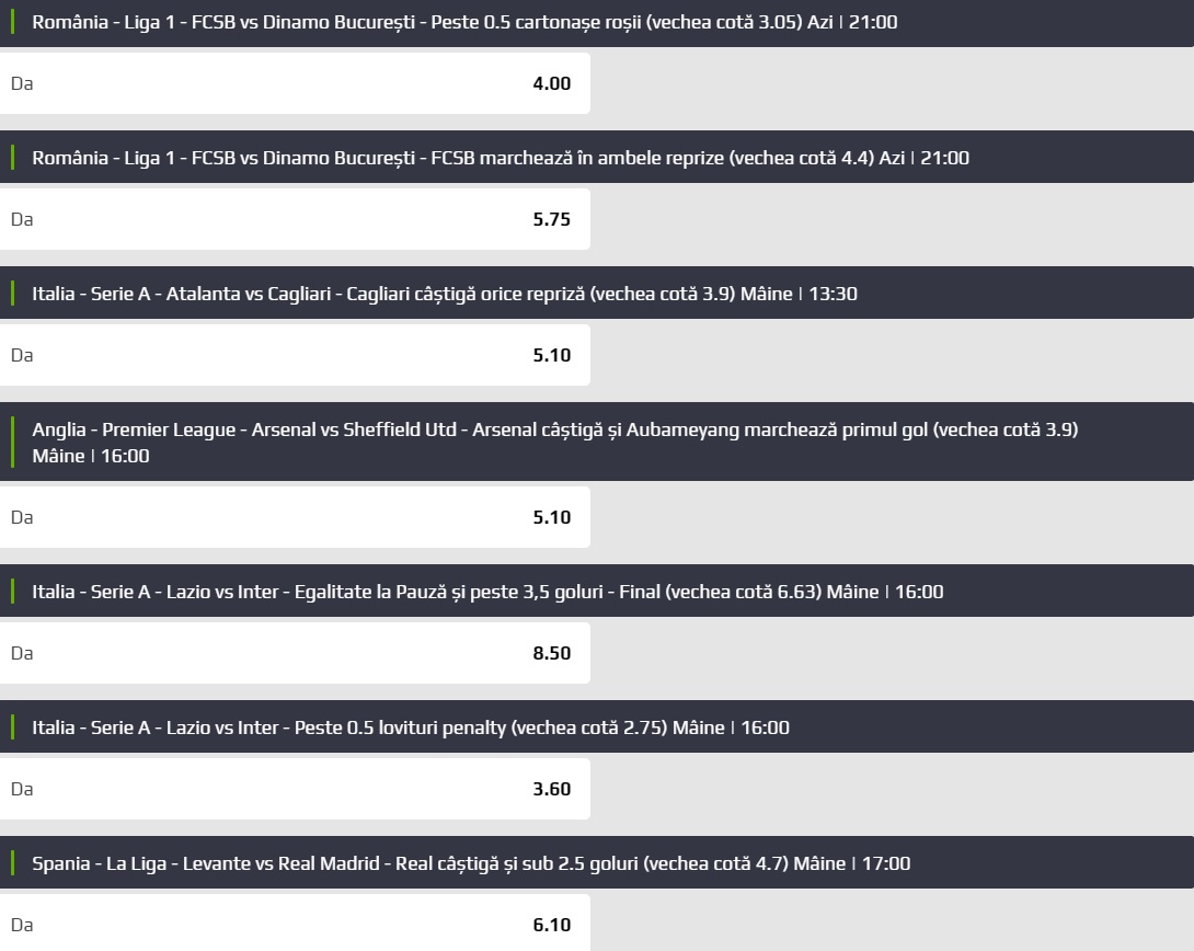 In acest weekend se vor desfasura confruntari de top in cele mai importante campionate europene! Cu siguranta, toti ochii iubitorilor „sportului rege” din Romania sunt atintiti catre derby-ul dintre FCSB si Dinamo Bucuresti. Netbet ti-a pregatit o oferta de nertat: cote marite ce iti pot aduce castiguri semnificativ mai mari pentru pronosticurile tale! Spre exemplu, pentru pariul „Cartonas rosu in meci la FCSB – Dinamo” ai acum cota 4.00, fata de 3.05, valoarea precedenta!