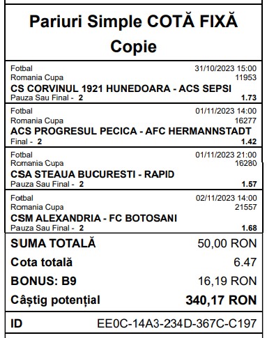 Cupa României: Biletul Etapei a doua din grupe are cota 6.47 »»