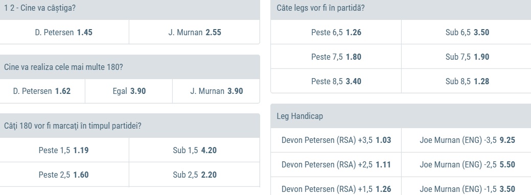 Cei doi jucatori debuteaza intr-un astfel de turneu. Petersen nu a mai jucat de pe 1 aprilie, atunci cand a facut-o in mai multe meciuri demonstrative, in vreme ce Murnam nu a mai jucat din 15 martie. Astfel, nici unul dintre ei nu poate spune ca se afla intr-o forma sportiva superioara adversarului din aceasta zi. De aceea, in vederea intocmirii celor mai bune pronosticuri, va trebui sa tinem cont de diferenta de valoare propriu-zisa dintre cei doi. Contrar clasamentului mondial, unde Petersen ocupa locul 56, iar Murnan se afla pe locul 72, suntem de parere ca jucatorul britanic este superior celui sud-african. Facand o analiza minutioasa a modului in care cei doi si-au construit clasamentul mondial putem desprinde faptul ca Petersen a avut adversari mult mai facili, in vreme ce Murnan, de mai multe ori, a trebuit sa dea piept cu „crema” darts-ului profesionist. Astfel, noi vom alege sa mizam pe un joc solid al acestuia din urma.