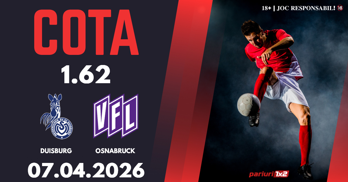 Duisburg – Osnabruck: 3.Bundesliga, al treilea eșalon al fotbalului din Germania, a ajuns la etapa cu numărul 32, iar lupta pentru promovare este echilibrată. Cotele la ponturi pariuri ne indică faptul că vom avea parte de un meci în care oaspeții sunt ușor favoriți, iar noi vă propunem un pronostic în cotă 1.62, bun pentru biletul zilei.