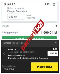 La agentia Betano, pariul „sub 7.5 șuturi pe poartă” are cota 2.75. Cu miza (informativa) putin peste 363 lei, am avea un profit final brut de 1000 lei.