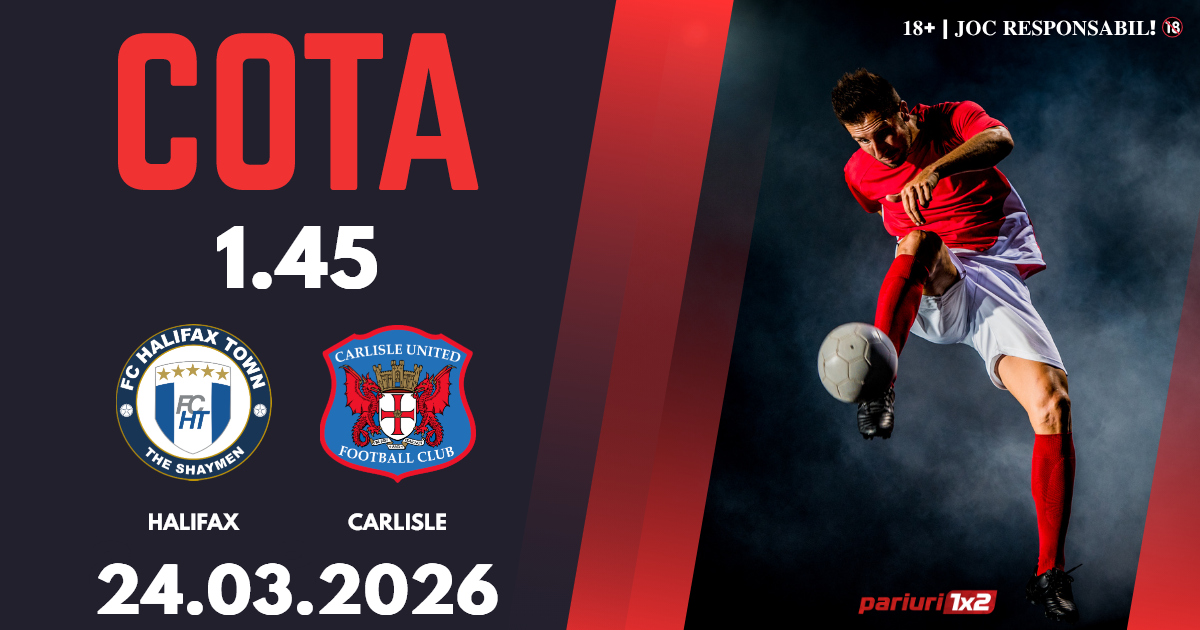 Halifax – Carlisle: National League, al 5-lea eșalon al fotbalului din Anglia, a ajuns la etapa cu numărul 40, iar lupta pentru promovare este foarte strânsă. Cotele la ponturi pariuri ne indică faptul că vom avea parte de un meci echilibrat, iar noi vă propunem un pronostic în cotă 1.45, bun pentru biletul zilei.