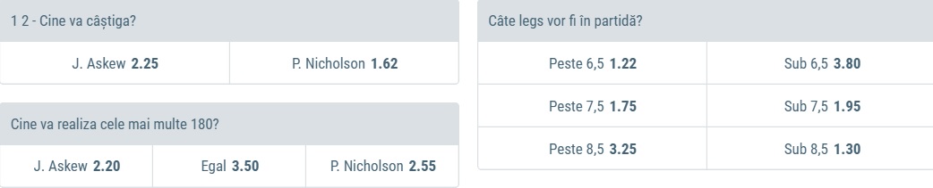 Datele generale ale partidei ne trimit catre doua pronosticuri cu o probabilitate extrem de mare de reusita. Paul Nicholson este deja un „obisnuit” al turneului Modus Icons of Darts, ce se desfasoara in aceasta perioada, acesta bifand 11 victorii si 9 infrangeri. In schimb, Jason Askew isi va face astazi debutul in cadrul acestui turneu. Consideram ca din cauza acestui fapt jucatorul britanic ar putea fi timorat impotriva experimentatului olandez. Mizam atat pe acest fapt, cat si pe forma ireprosabila a lui Nicholson, ce a bifat 7 victorii in ultimele 8 meciuri.
