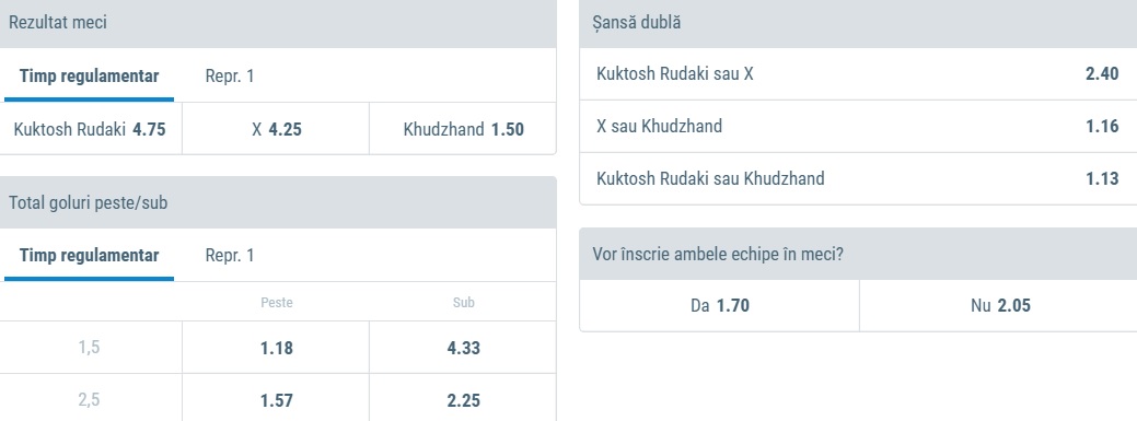 Cele doua formatii au avut prestatii asemanatoare in primele 2 etape. In vreme ce Kuktosh a reusit sa acumuleze 4 puncte in urma victoriei de pe terenul celor de la Istaravshan (scor 3-0) si a remizei de pe teren propriu cu Regar-TadAZ (scor 0-0), Khujand a reusit sa obtina 3 puncte in urma succesului din prima runda inregistrat pe terenul lui TSKA Pomir Dushanbe (scor 3-1). Punctele castigate le pozitioneaza pe cele doua formatii pe locurile 6 si respectiv 7 in prima liga in Tadjkikistan. Totusi, conform specialistilor Vysshaya Liga, aceste pozitii nu sunt argumentate de valoarea trupelor, atat Kuktosh, cat si Khujand, fiind echipe cu pretentii la calificarea in cupele continentale. In acest sens, suntem de parere ca cele doua echipa vor face tot ceea ce le sta in putinta pentru a reusit sa obtina toate cele 3 puncte puse in joc. De aceea, ne vom orienta catre 2 pariuri bazate pe numarul golurilor.