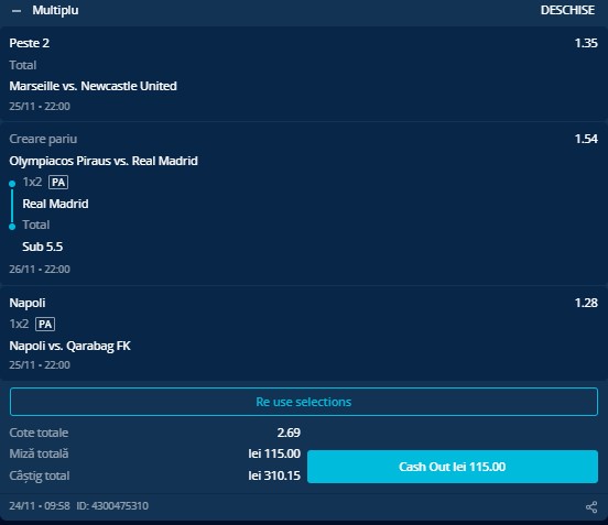 Operațiunea Jackpot în Champions League: Vezi Biletul Zilei | Pariuri lui Sabin (25-26 noiembrie) – construim biletul zilei cu ponturi pariuri Liga Campionilor! În prim plan, Napoli, Real Madrid și Marseille – Newcastle.
