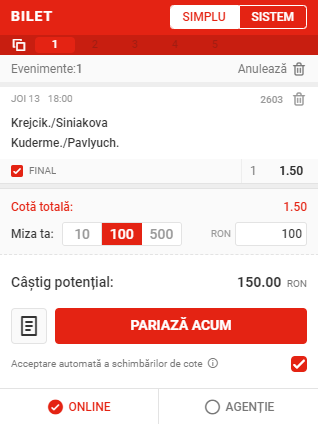 18:00: Krejcikova/Siniakova – Kudermetova/Pavlyuchenkova, 1, cota 1.50 la Superbet;