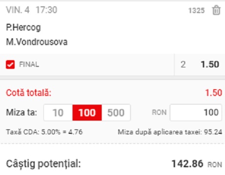 17:30, Hercog – Vondrousova, 2, cota 1.50 la Superbet;