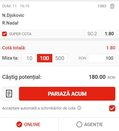 16:10: N. Djokovic – R. Nadal, victorie Nadal, cota 1.80 la Superbet;
