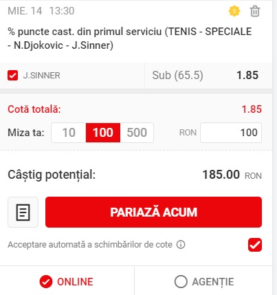 13:30 Novak Djokovic – Jannik Sinner, Sinner sub 65.5% puncte castigate din primul serviciu, cota 1.85 la Superbet;