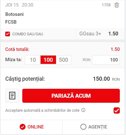 20:30 Botosani – FCSB, ambele inscriu sau peste 2.5 goluri, cota 1.50 la Superbet;