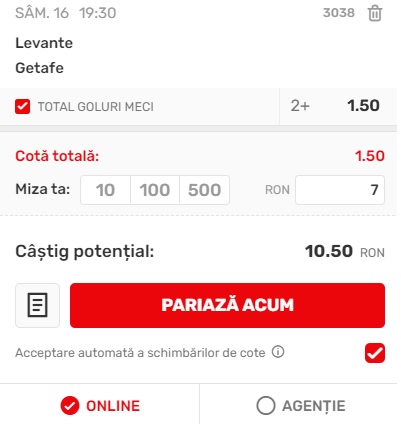 19:30 Levante – Getafe, peste 1.5 goluri, cota 1.50 la Superbet;