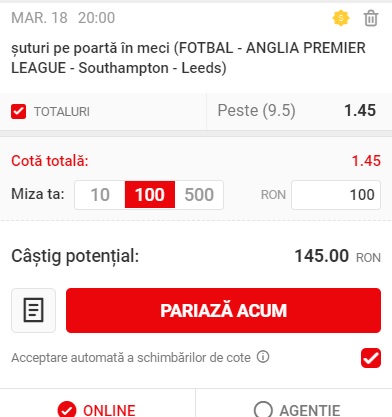 20:00 Southampton – Leeds, peste 9.5 suturi pe poarta, cota 1.45 la Superbet;