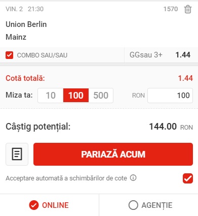 21:30: Union Berlin – Mainz, ambele inscriu sau peste 2.5 goluri, cota 1.44 la Superbet;