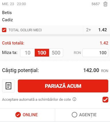 23:00: Betis – Cadiz, peste 1.5 goluri,  cota 1.42 la Superbet;