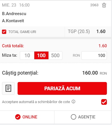 16:00 Bianca Andreescu – Anett Kontaveit, peste 20.5 game-uri, cota 1.60 la Superbet;