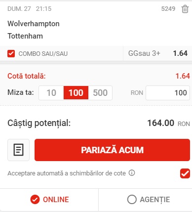 Duminica revenim la treaba cu pariul zilei si investim in selectia „ambele inscriu sau peste 2.5 goluri” in partida Wolverhampton – Tottenham, programata de la ora 21:15. Cote oferita de Superbet, 1.64, este excelenta si merita plasata in conditiile in care s-au marcat minim doua goluri in ultimele 8 intalniri directe, iar selectia „ambele inscriu” s-a „inverzit” in 7 din aceste cazuri. Dupa ultimele infrangeri, elevii lui Jose Mourinho nu isi mai permit pasi gresiti, iar echipa lui Nuno Santo ramane una greu de invins in Premier League.