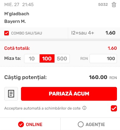 21:45 Monchengladbach – Bayern, peste 1.5 goluri in prima repriza sau peste 3.5 goluri in meci, cota 1.60 la Superbet;