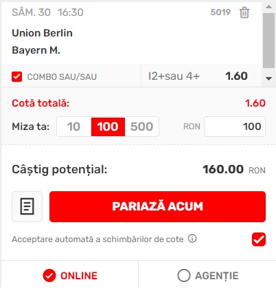 16:30 Union Berlin – Bayern, peste 1.5 goluri in prima repriza sau peste 3.5 goluri in meci, cota 1.60 la Superbet;