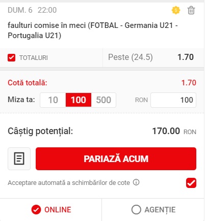 22:00 Germania U21 – Portugalia U21, peste 24.5 faulturi, cota 1.70 la Superbet;