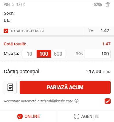 18:00: Sochi – Ufa, peste 1.5 goluri,  cota 1.47 la Superbet;