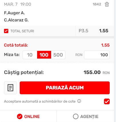 19:00 Felix Auger-Aliassime – Carlos Alcaraz, peste 3.5 seturi, cota 1.55 la Superbet;