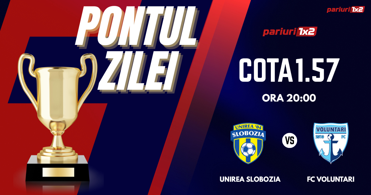 Pentru Pontul Zilei mergem la partida dintre Unirea Slobozia și FC Voluntari, meci contând pentru returul barajului de promovare/menținere în Superliga. Duelul dintre cele două formații va avea loc pe Stadionul din Clinceni, începând cu ora 20.00. Oaspeții au avantajul victoriei la limită obținută acum o săptămână dar elevii lui Mihalcea au arătat că știu cum să joace partidele decisive. Chiar dacă meciul se anunță unul echilibrat, este clar că ialomițenii au plusul de valoare dar asta nu înseamnă automat și păstrarea locului din Superliga. Pronosticul nostru pentru acest meci este Unirea Slobozia marchează 1-2 goluri.