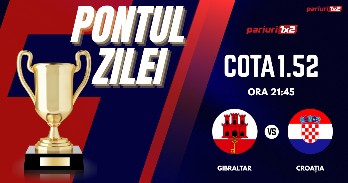 Pentru Pontul Zilei mergem la partida dintre Gibraltar și Croația, meci contând pentru etapa cu numărul trei din calificările pentru Cupa Mondială, grupa L. Duelul dintre cele două formații va avea loc pe Estádio Algarve din Faro/Loulé, începând cu ora 21.45. Oaspeții abia încep meciurile din această grupă, celelalte formații având deja câte două meciuri disputate. Gibraltar este una dintre cele mai slabe naționale din lume și va fi foarte greu să reziste în fața Croaților. Diferența de valoare dintre cele două formații este colosală, iar pronosticul nostru este Croația marchează peste 3.5 goluri.