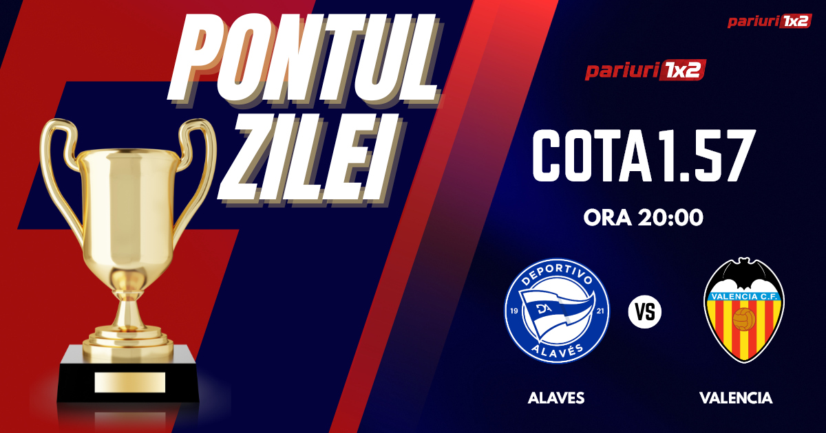 Pentru Pontul Zilei mergem la partida dintre Alaves și Valencia, meci contând pentru etapa cu numărul 36 din La Liga. Duelul dintre cele două formații va avea loc pe Estadio Mendizorrotza din Vitoria-Gasteiz, începând cu ora 20.00. Gazdele luptă pentru evitarea retrogradării și au nevoie disperată de cele trei puncte fiind la doar o lungime de Leganes, prima formație aflată sub linia roșie. Valencia, chiar dacă a început rău acest sezon, este fără griji pe finalul acestui sezon fiind salvată de retrogradare. Mizăm pe un meci echilibrat în care bascii nu vor pierde. Pronosticul nostru este 1x și sub 3.5 goluri.
