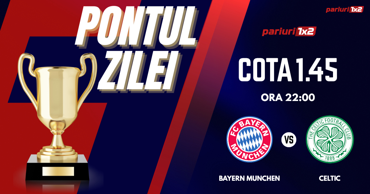 Pentru Pontul Zilei mergem la partida dintre Bayern Munchen și Celtic, meci contând pentru returul 1/16-imilor de finală din Liga Campionilor. Duelul dintre cele două formații va avea loc pe Allianz Arena din Munchen începând cu ora 22.00. În tur, bavarezii au învins cu scorul 2-1 și au luat o opțiune importantă de a ajunge în optimile de finală ale competiției. Diferența de valoare este evidentă în favoarea nemților iar scoțienii nu au de ce să se mai apere în partida de la Munchen. Mizăm pe un joc spectaculos iar pronsoticul nostru este 3-6 goluri în meci.