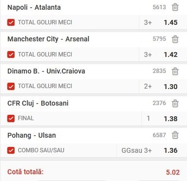 Biletul weekend-ului din aceasta saptamana este format dintr-un combo de 5 evenimente, cu o cota totala de 5.02. Varianta debuteaza cu doua pariuri de „peste 2.5 goluri”, in derby-urile Napoli – Atalanta (sambata, ora 18:30) si Manchester City – Arsenal (sambata, ora 19:30). Continuam cu 1 solist la partida CFR Cluj – Botosani, din Liga 1 (sambata, ora 21:30), iar ultimele doua selectii au fost rezervate pe duminica. De la ora 13:00, disputa din Coreea de Sud, Pohang – Ulsan, anunta goluri si polite de platit, dupa evenimentele din sezonul trecut, iar meciul Dinamo – Craiova, de la ora 21:30, completeaza biletul propus.