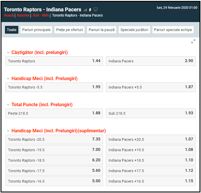 Victorie Toronto Raptors (inclusiv prelungiri) – Cota 1.44 la Betano
