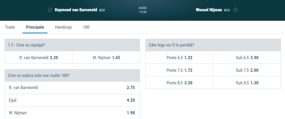 Miercuri, incepand cu ora 13:30, se va disputa partida Raymon van Barneveld – Wessel Nijman, meci din cadrul turneuli Modus Icons of Darts.
