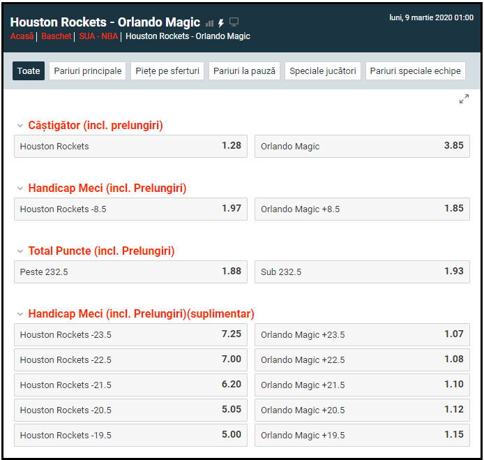 Houston Rockets si Orlando Magic se intalnesc intr-o partida din cadrul sezonului regulat din NBA. Confruntarea se va disputa luni, nu inainte de ora 01:00, in Toyota Center.