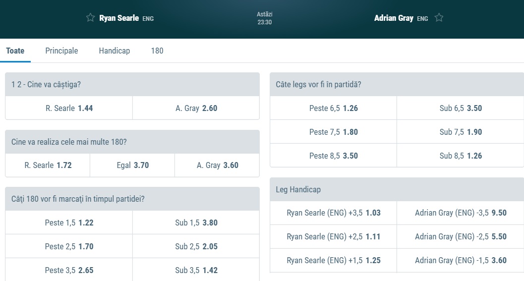 Miercuri, incepand cu ora 23:30, va avea loc partida Ryan Searle – Adrian Gray, din cadrul turneului de darts PDC Home Tour.