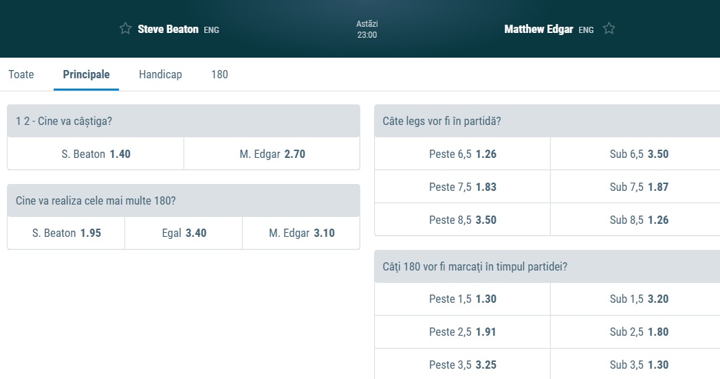 Confruntarea dintre cei doi britanici este una dintre cele mai asteptate meciuri ale zilei. Favoritul principal al inclestarii este Steve Beaton, aflat pe pozitia cu numarul 26 in ierarhia mondiala. Adversarul sau, Matthew Edgar, ocupa locul 62 in clasamentul mondial. Nici unul dintre cei doi jucatori nu trece printr-o perioada buna, insa, cu siguranta, forma lui Edgar este una extrem de precara. Acesta vine dupa 7 infrangeri consecutive (inaintea oricarui meci de miercuri – subliniem acest aspect deoare inaintea confruntarii cu Beaton, Edgar va mai avea un meci in PDC Home Tour). Mai mult decat, acesta va pleca in perspectiva meciului impotriva conationalului sau si cu handicapul istoricul intalnirilor directe, Beaton castigand cele 2 intalniri precedente. Noi, in perspectiva alegerii celor mai bune selectii, alegem sa tinem cont de toate aspectele mentionate anterior si sa pariem in consecinta.
